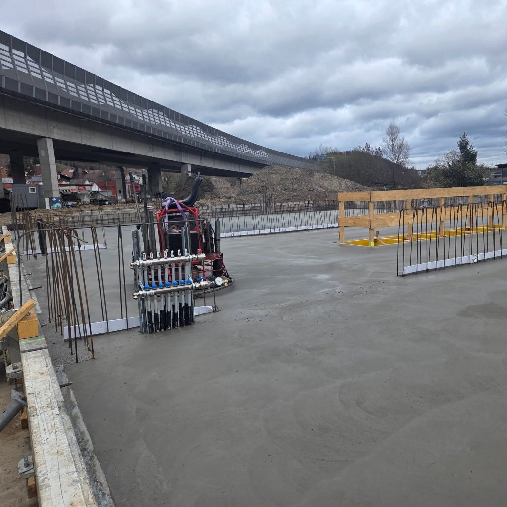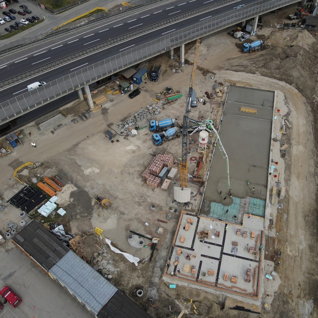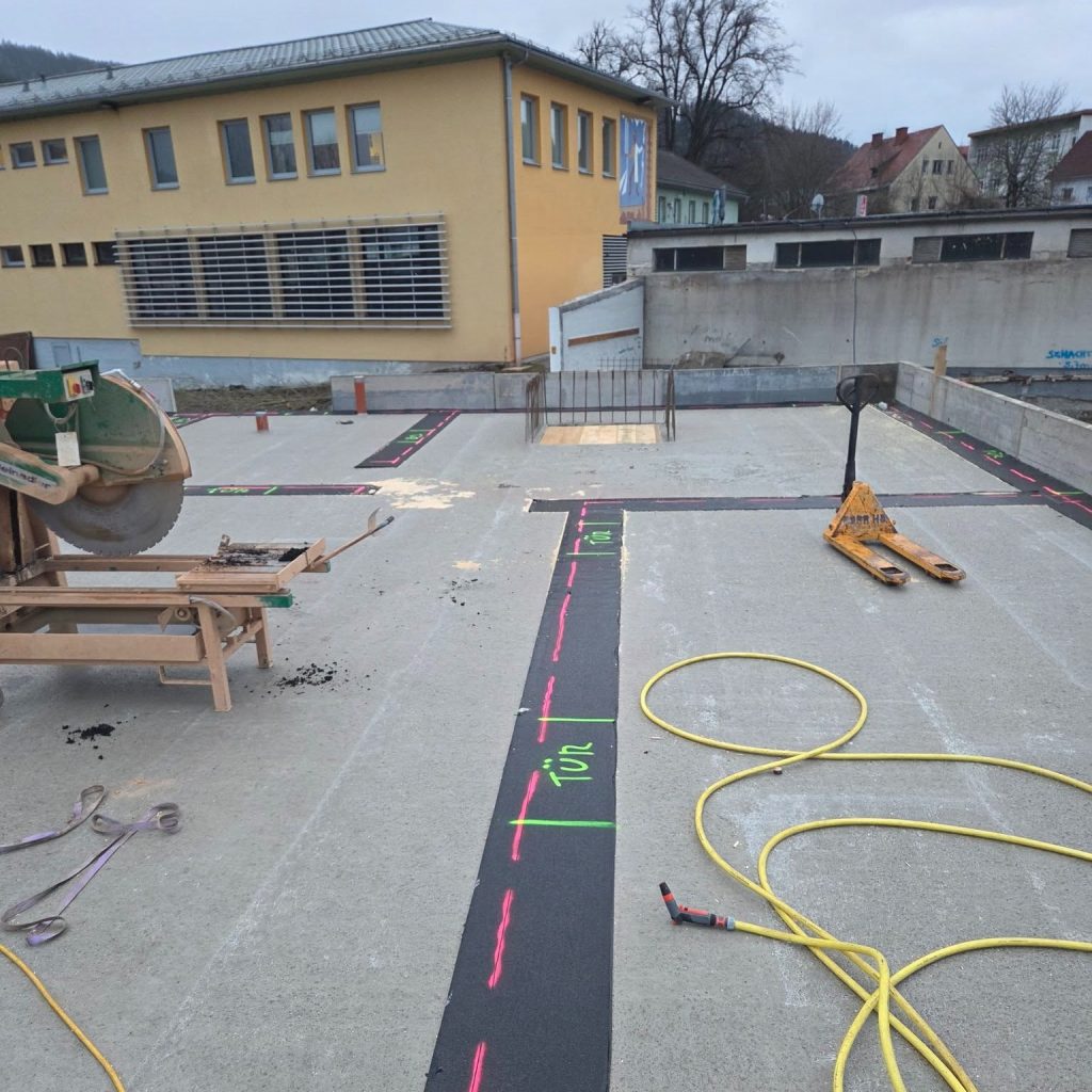 Das Fundament des neuen Rüsthauses ist errichtet – und die weiteren Bauarbeiten am Roßdorfplatz sind in vollem Gange. Nach der Verlegung der Betonkernaktivierung und der Fertigstellung der betonierten Bodenplatte haben nun auch die Hochbauarbeiten im Bereich des Verwaltungsgebäudes begonnen.